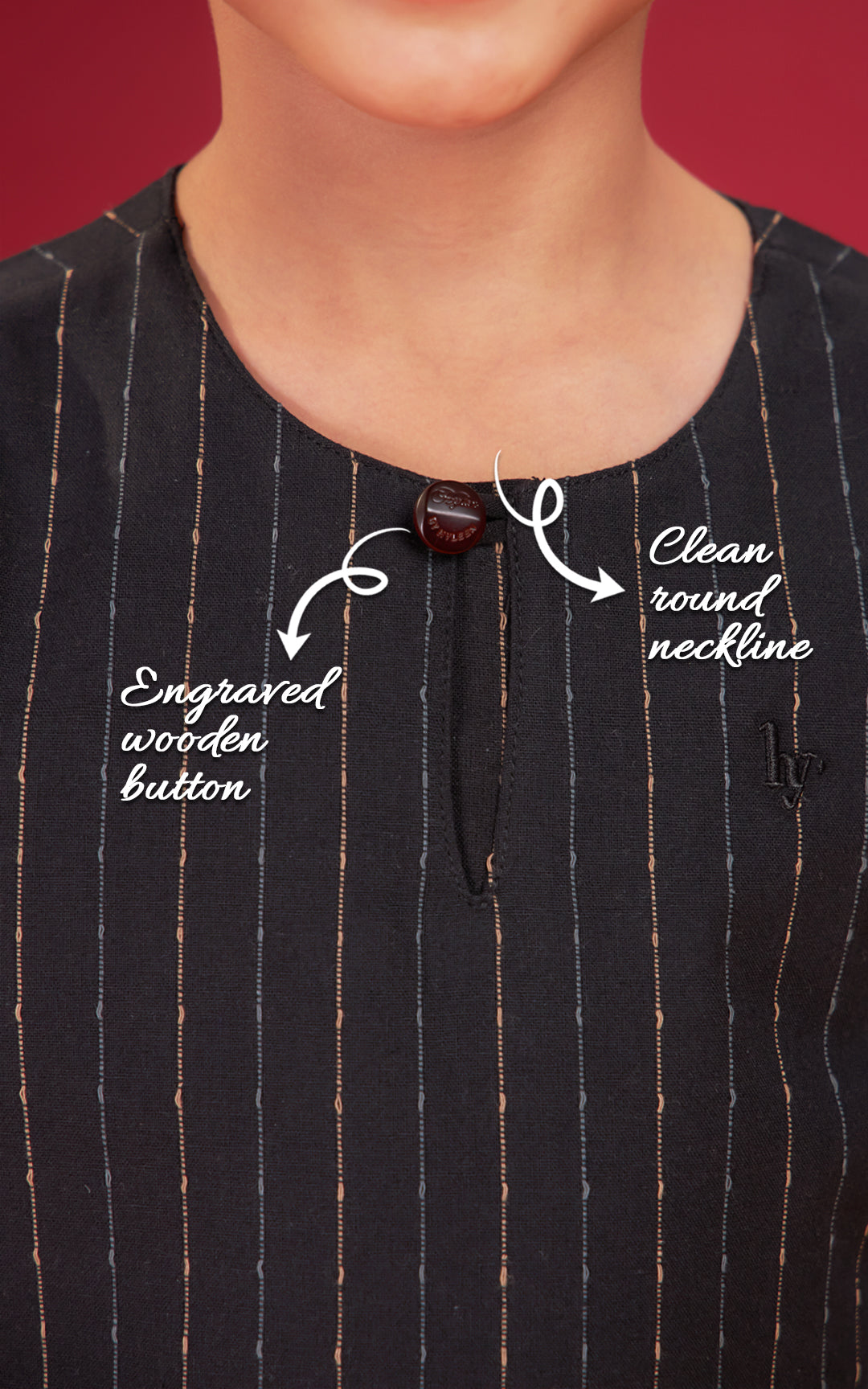 • Clean Round Neckline, Secure with a Logo Engraved Wooden Button