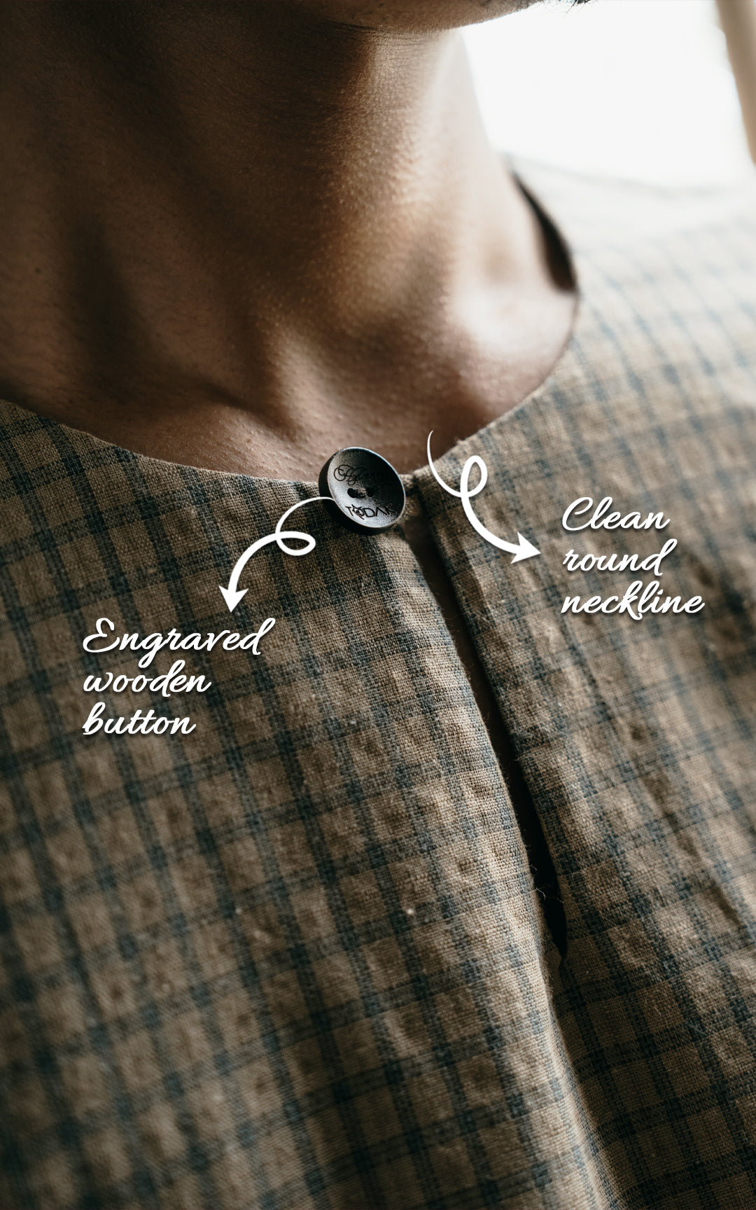 • Clean Round Neckline, Secure With A Wooden Button Engrave With Logo