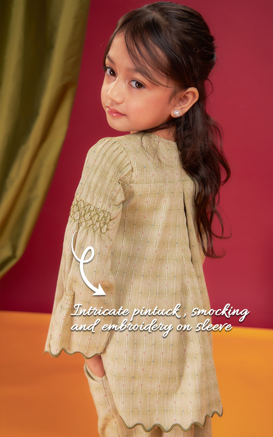 • Intricate Pintuck, Smocking & Embroidery Detailing On Outer Layer & Sleeve